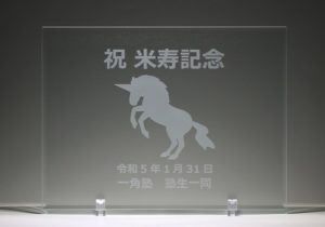 記念品には一角塾のロゴイラスト(ユニコーン)を描いたペアグラスやマウスパッドが贈呈されました。